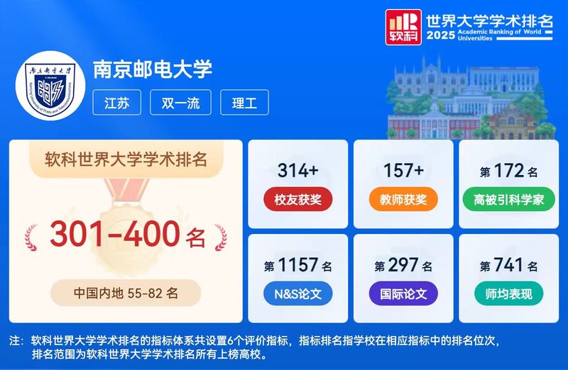 | 南京邮电大学位居2025软科世界大学学术排名全球第376名 |
